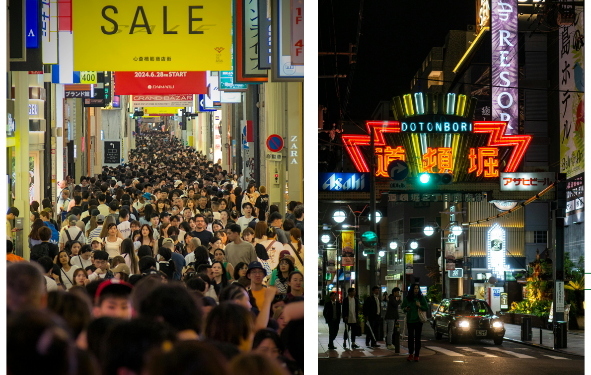 도톤보리는 단순한 사진 명소를 넘어, 오사카의 길거리 음식을 가장 다양하게 즐길 수 있는 중심지이기도 합니다. 타코야키, 오코노미야키, 쿠시카츠 등 일본 특유의 먹거리가 즐비해 있어 걷는 내내 식욕을 자극합니다. 특히 ‘크레이지 타코야키’와 ‘니혼이치 크랩’ 같은 인스타 인기 맛집은 줄을 서서 먹을 만큼 유명합니다.