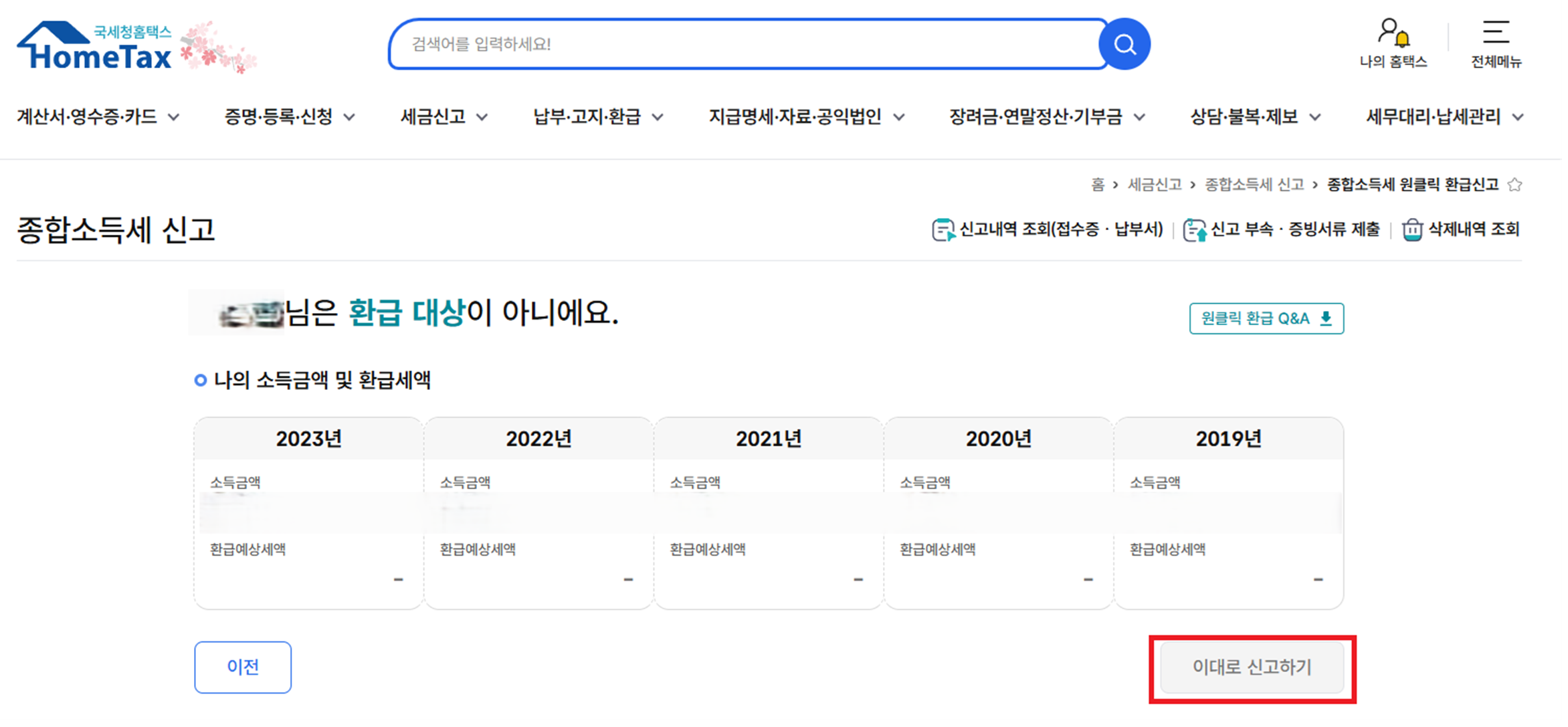 👉 조회된 환급금이 있다면 간단하게 신청 완료! ( 참고로 환급대상자가 아니기에 이대로 신고하기가 비활성화 입니다.)